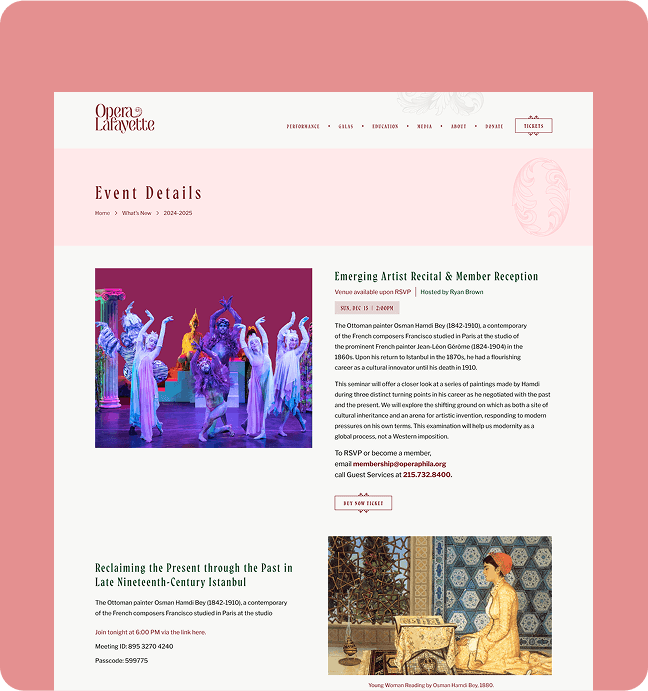 I designed a fresh digital experience that reflects Opera Lafayette’s rich cultural legacy — while making it easy for users to browse shows, buy tickets, and learn more about the organization.